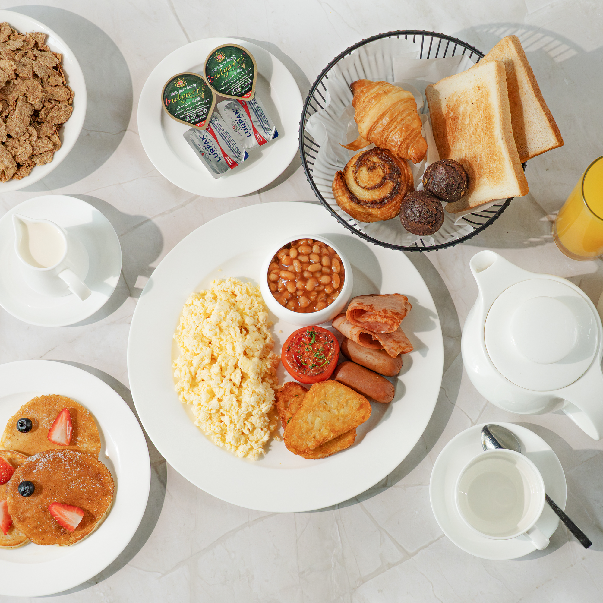 The narrative captures quiet, intimate moments in a guest’s stay. Morning light softly illuminates a breakfast setting of warm khubuz, labneh, olives, fresh dates, and a steaming cup of karak, served on the hotel’s standard crockery. The styling is minimal, focusing on neat presentation, balanced composition, and natural textures that enhance appeal without exaggeration.